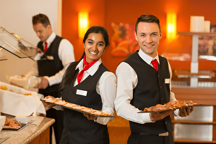 Trained restaurant waiters and waitresses delivering courteous service for a dining experience.